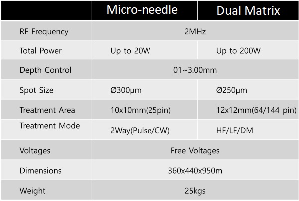 دستگاه آر اف میکرونیدل فرکشنال فلوراسل دارای دو هندپیس میکرو نیدل (RF Microneedle) و بدون نیدل (Dual Matrix) است که برای درمان‌های متفاوتی استفاده می‌شوند. در روش بدون نیدل، تنها انرژی حرارتی به صورت چند بعدی با فرکانس بالا به سطح پوست فرستاده می‌شود و انرژی به صورت یکدست تمام سطح را می‌پوشاند. بنابراین جوانسازی پوست کاملا بدون درد و موثر خواهد بود که با توجه به وضعیت پوست و نیازهای آن، می‌تواند در سه سطح کم قدرت (W60)، قدرت متوسط (W70) و قدرت زیاد (W90) تنظیم شود. تصاویر زیر این هندپیس‌ها را نشان داده است.